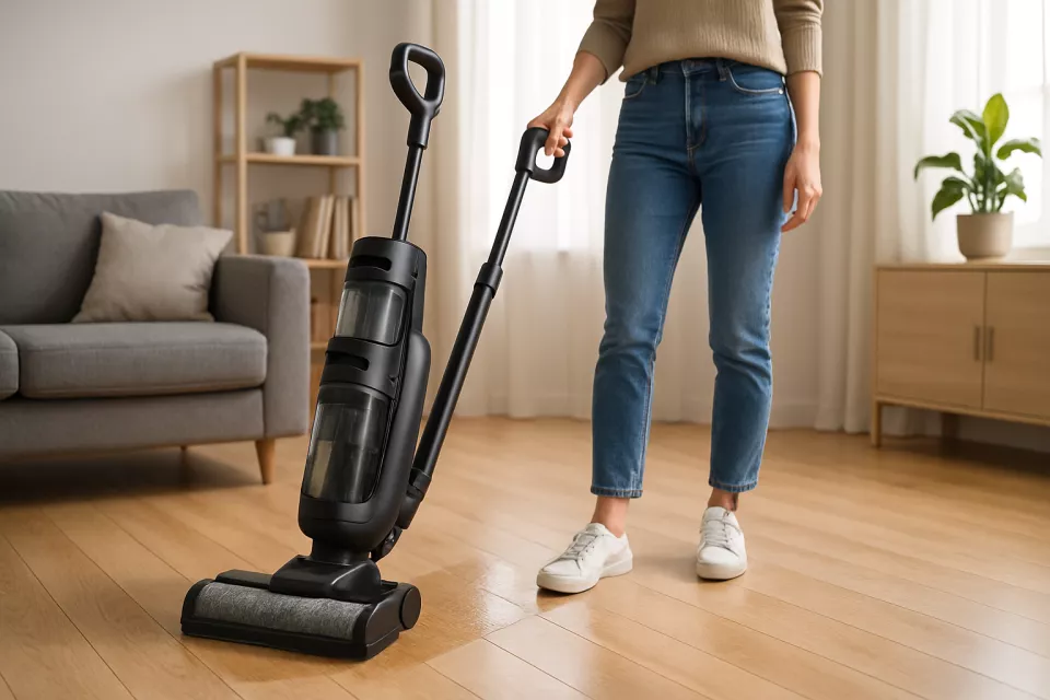 Aspirador friegasuelos inalambrico limpiando suelo salon
