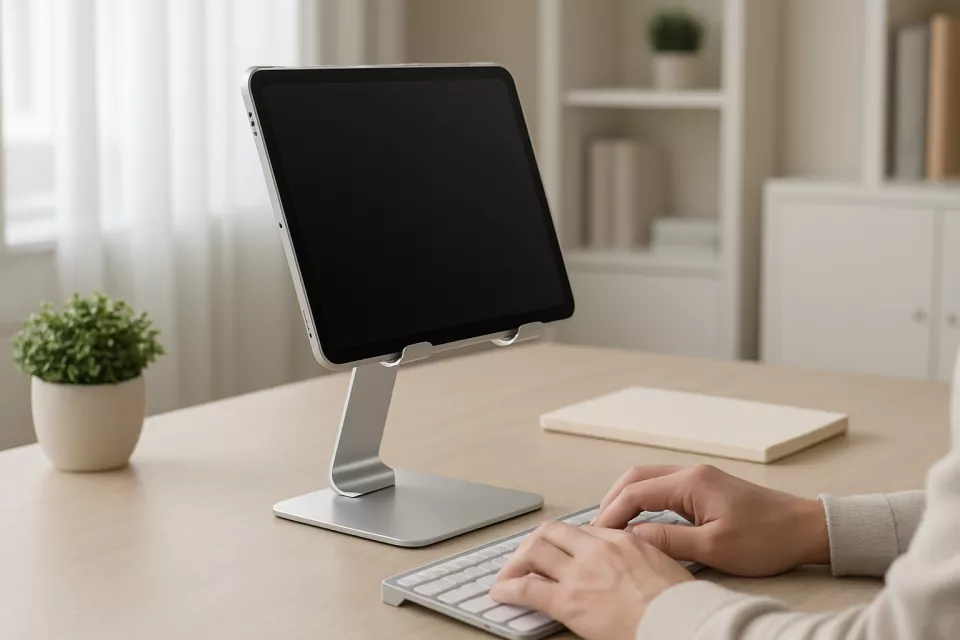 Si usas la tablet como segunda pantalla junto al portatil, busca soportes con brazo lateral que permitan colocar la tablet al lado de la pantalla principal. Esto reduce el giro del cuello respecto a tener la tablet plana sobre la mesa. Para un escritorio ordenado, combina el soporte con un organizador de escritorio que mantenga todo en su sitio.